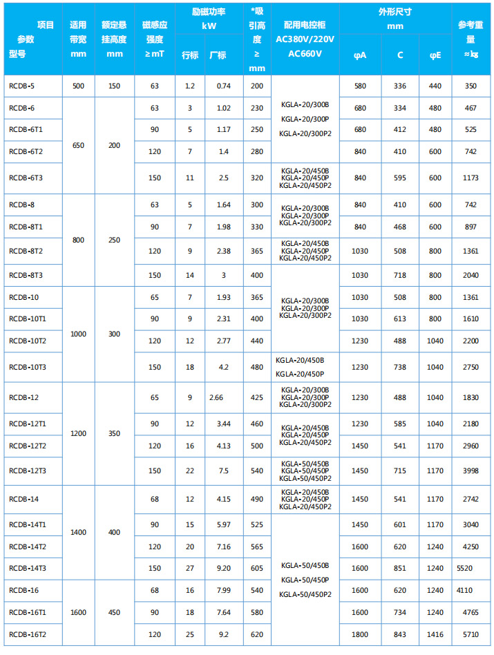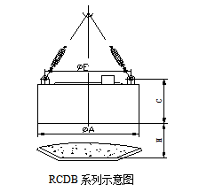 四、RCDB系列懸掛盤式自冷電磁除鐵器主要技術(shù)參數(shù)、外形尺寸 執(zhí)行標(biāo)準(zhǔn):JB/T7689